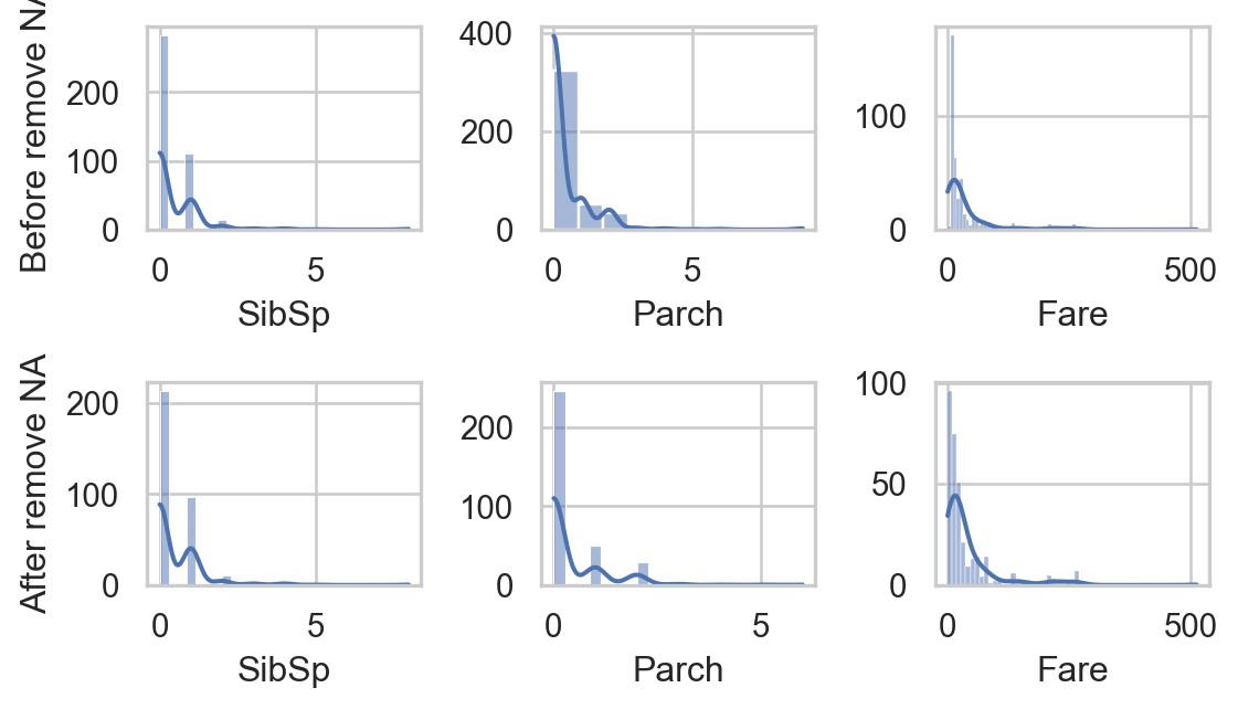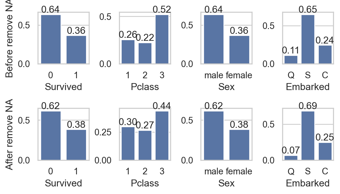 import seaborn as snsimport matplotlib.pyplot as pltsns.set(style="whitegrid")fig, axs = plt.subplots(2, 4, figsize=(6, 3.5))col_qual = ['Survived', 'Pclass', 'Sex', 'Embarked']for i, va inenumerate(col_qual): sns.countplot(data, x=va, ax=axs[0,i], stat ="proportion") axs[0,i].bar_label(axs[0,i].containers[0], fmt="%0.2f") sns.countplot(data.dropna(), x=va, ax=axs[1,i] , stat ="proportion") axs[1,i].bar_label(axs[1,i].containers[0], fmt="%0.2f")if i ==0: axs[0,i].set_ylabel("Before remove NA") axs[1,i].set_ylabel("After remove NA")else: axs[0,i].set_ylabel("") axs[1,i].set_ylabel("")plt.tight_layout()plt.show()