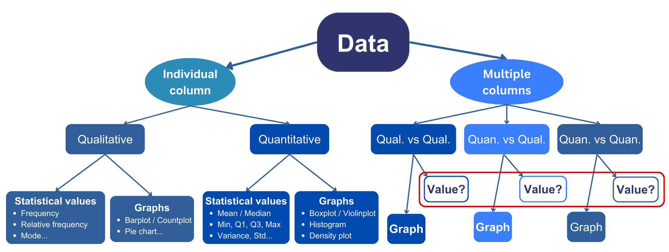 - Correlation between two quan. columns \(X\) and \(Y\): \[r=r_{X,Y}=\frac{\sum_{i=1}^n(\text{x}_{i}-\overline{x})(\text{y}_{i}-\overline{y})}{\sqrt{\left(\sum_{i=1}^n(x_{i1}-\overline{x}_{1})^2\right)\left(\sum_{i=1}^n(x_{i2}-\overline{x}_{2})^2\right)}}=\frac{\text{Cov}(X,Y)}{s_Xs_Y}.\]