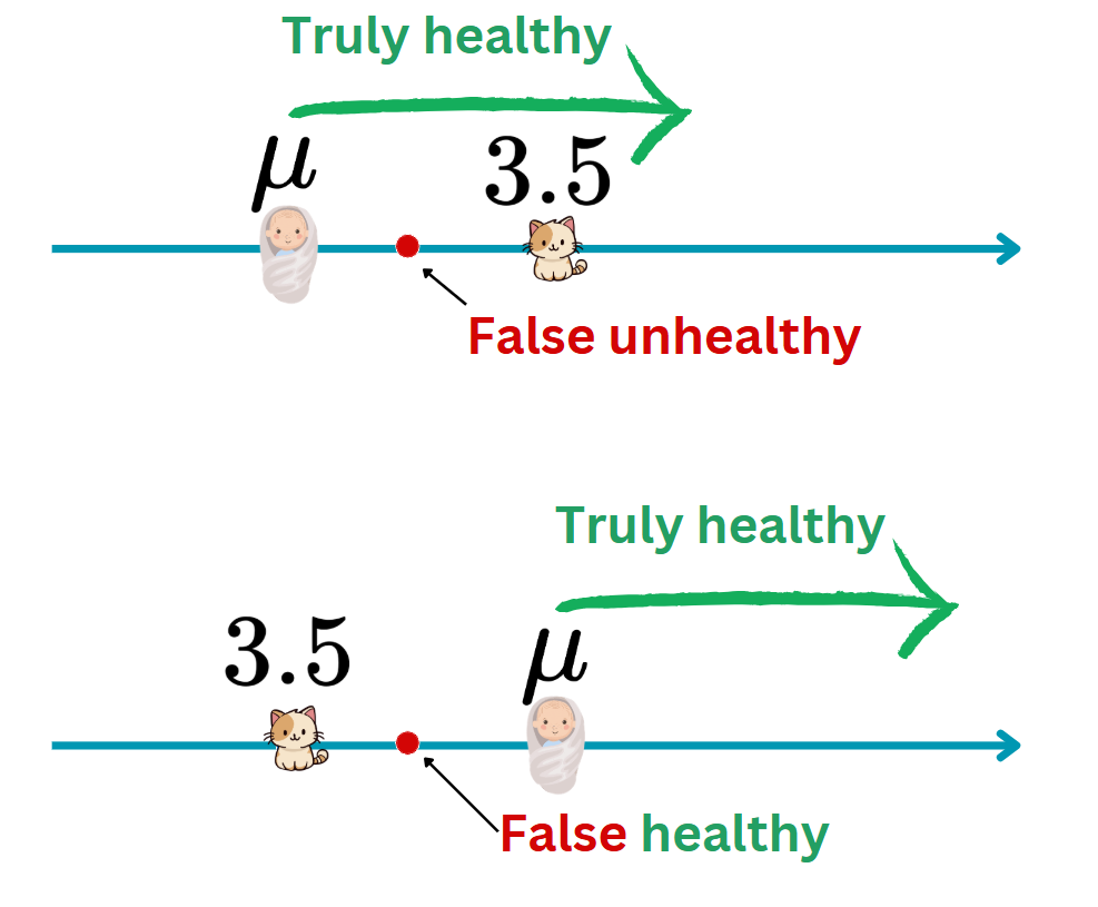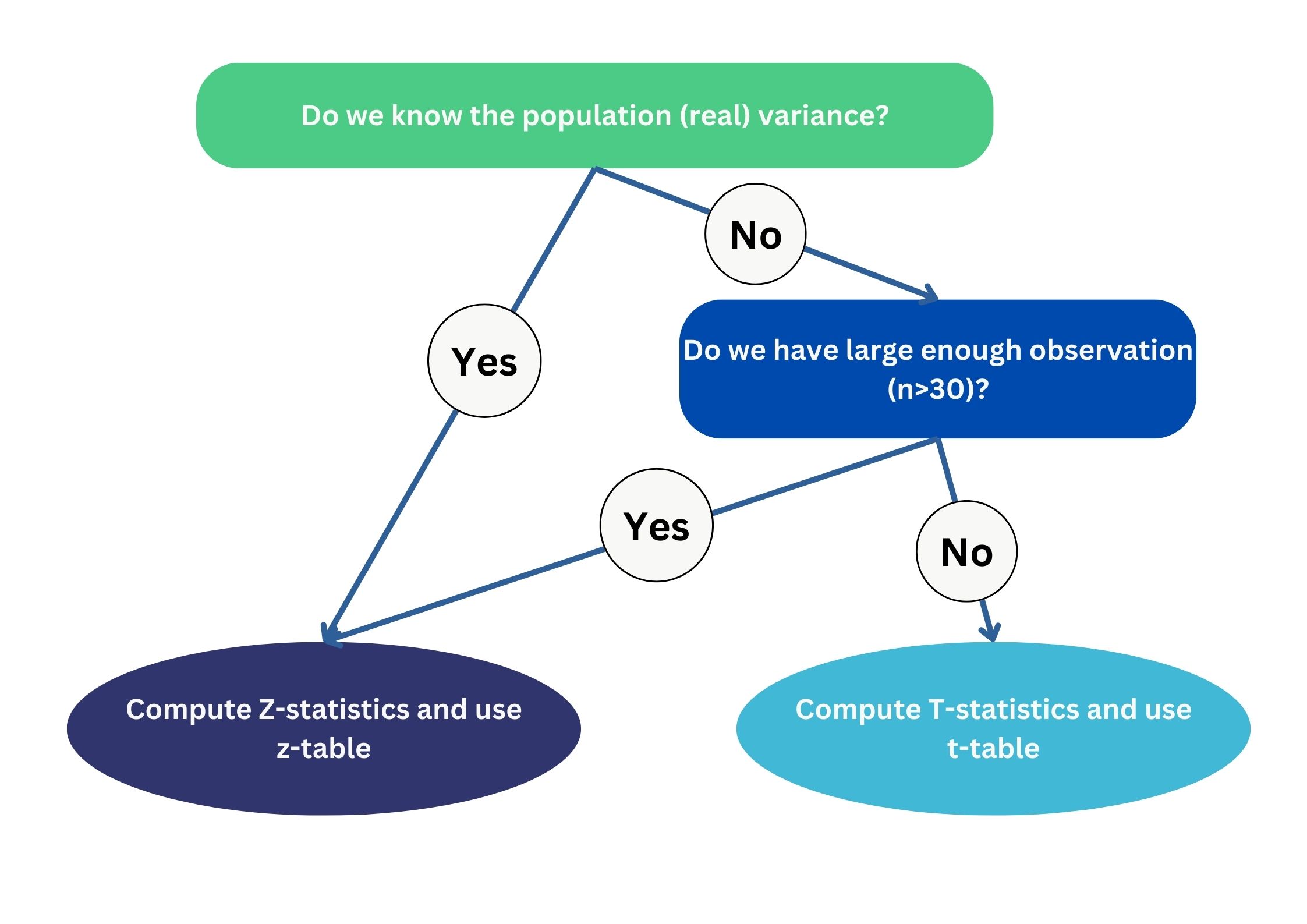 In this chapter, we aim to test simple hypothesis testing of the form: \[\begin{cases}\color{red}{H_0}:\mu=\color{blue}{\mu_0}\\{ }\\ \color{green}{H_1}: \mu\underset{<}{\overset{>}{\neq}} \color{blue}{\mu_0},\end{cases}\]