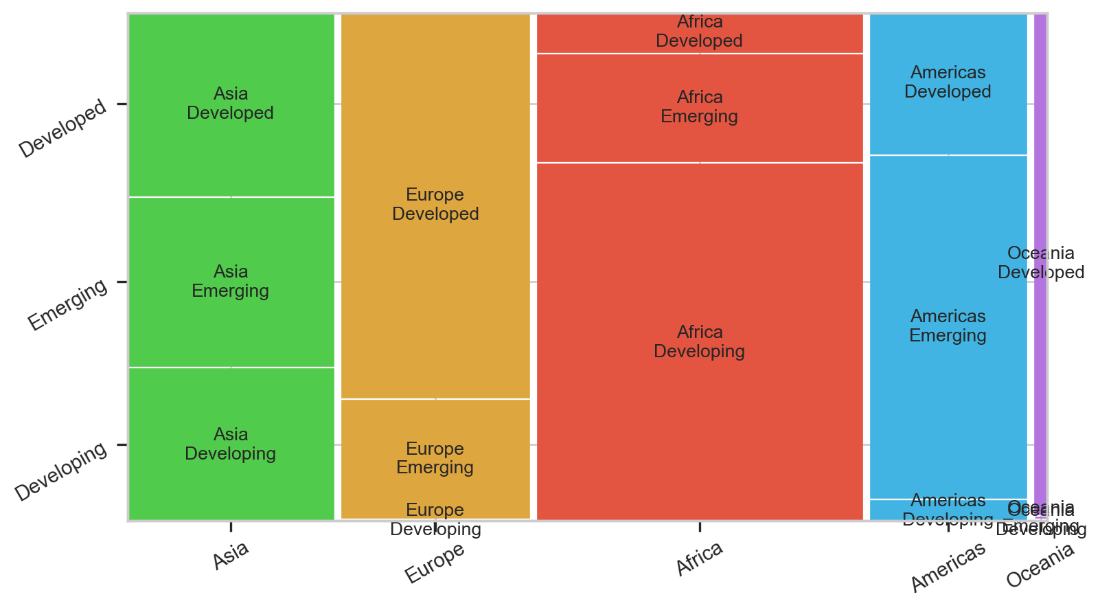 mosaic(data2007, ['continent','gdp_category'], gap=0.01, properties = prop, label_rotation=30, ax=ax)