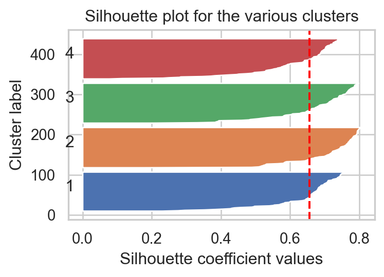 Silhouette value for any data point \(\color{blue}{\text{x}_i}\) is defined by: \[-1\leq s(\color{blue}{i})=\frac{b(\color{blue}{i})-a(\color{blue}{i})}{\max\{a(\color{blue}{i}),b(\color{blue}{i})\}}\leq 1.\]