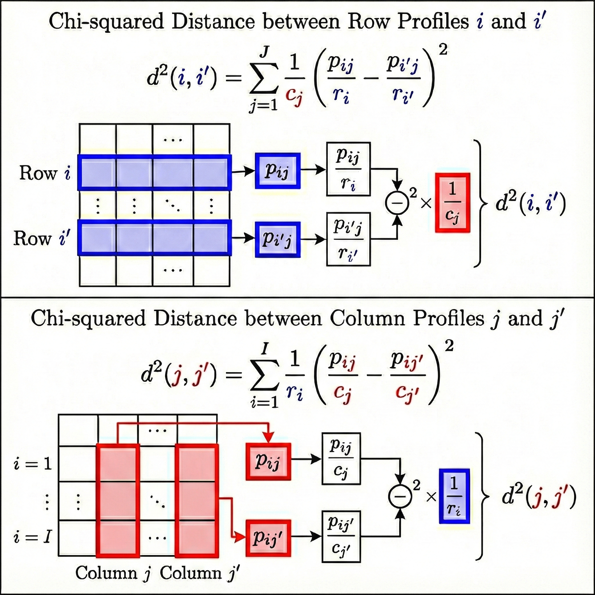 • Total inertia of column profiles: \[\color{red}{I_Y}=\sum_{j=1}^{J}\color{red}{c_j}d^2(\color{red}{j}, \color{red}{\text{c}})=\sum_{j=1}^{J}\color{red}{c_j}\sum_{i=1}^{I}\frac{1}{\color{blue}{r_i}}\left(\frac{p_{i\color{red}{j}}}{\color{red}{c_j}} - \color{blue}{r_i}\right)^2=\sum_{i,j}\frac{(p_{\color{blue}{i}\color{red}{j}}-\color{blue}{r_i}\color{red}{c_j})^2}{\color{blue}{r_i}\color{red}{c_j}}\]