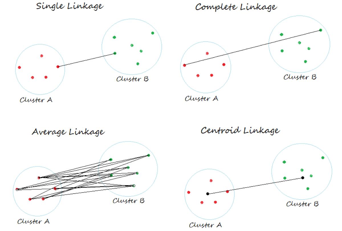 Average Linkage \(d_{\text{AL}}(A, B) = \frac{1}{|A||B|} \sum_{a \in A} \sum_{b \in B} \|a, b\|^2\)